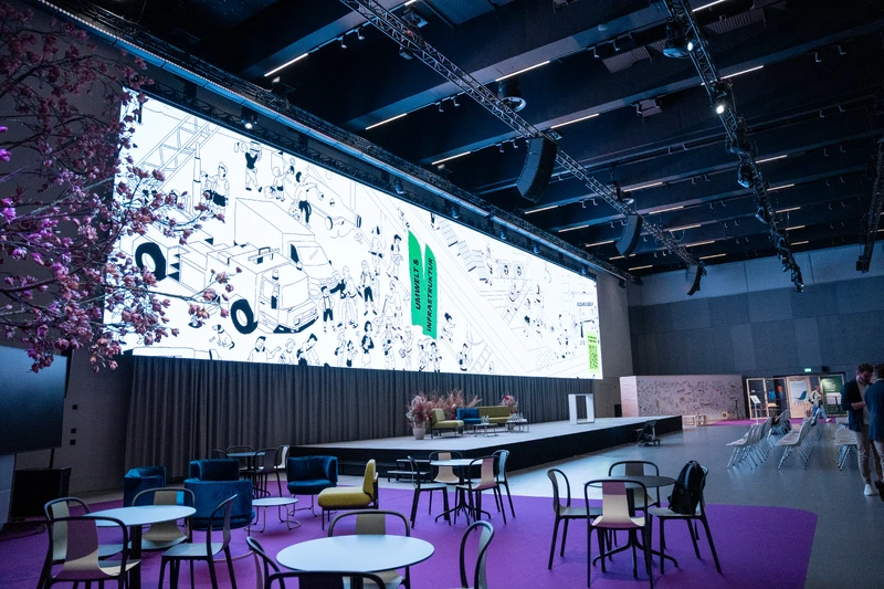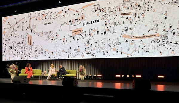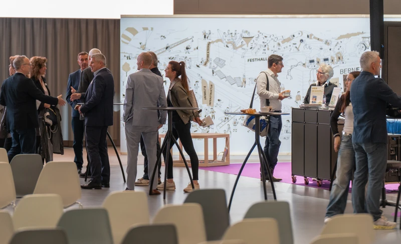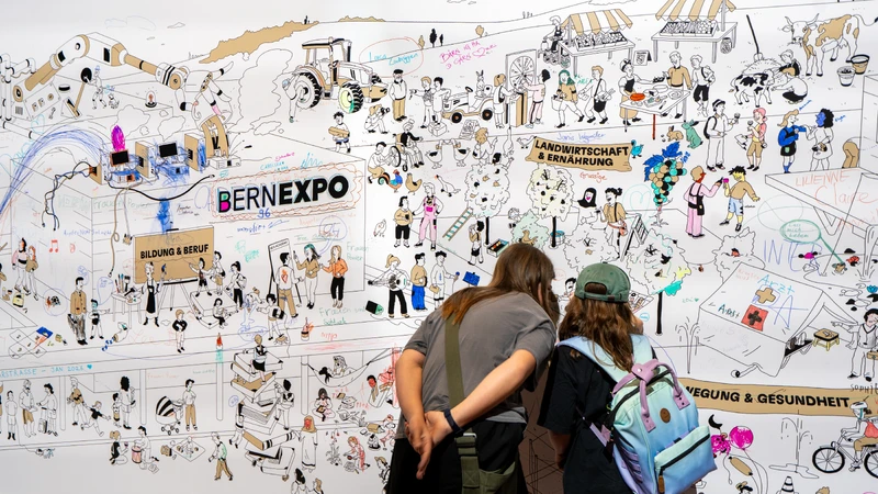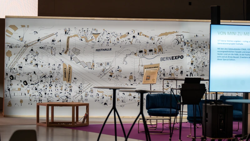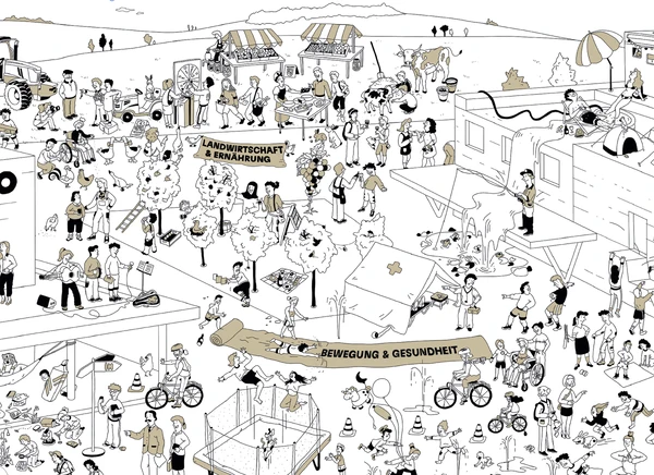 Die BERNEXPO hat seit 2025 eine neue, goldene und grosse Festhalle, welche feierlich eröffnet werden sollte. Hierzu wurde ein Wimmelbild als Aufhänger gewünscht, welches die 7 Themenbereiche der Messe spielerisch visualisieren und somit durch die Feier führen sollte.