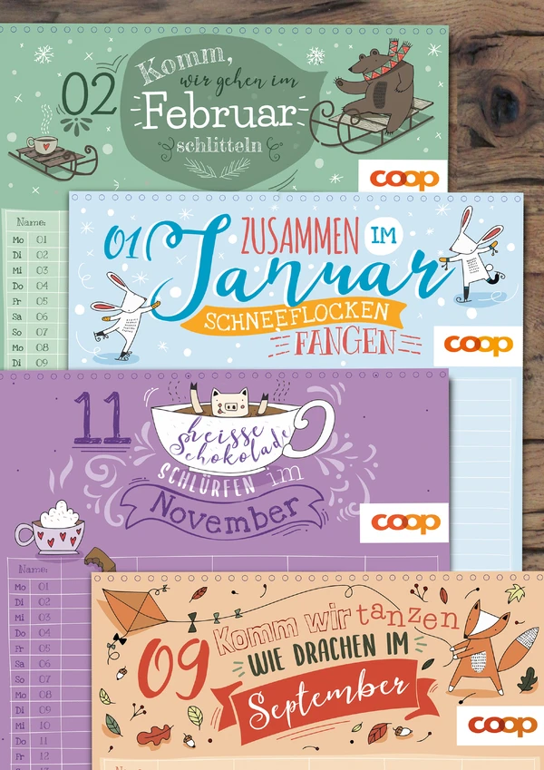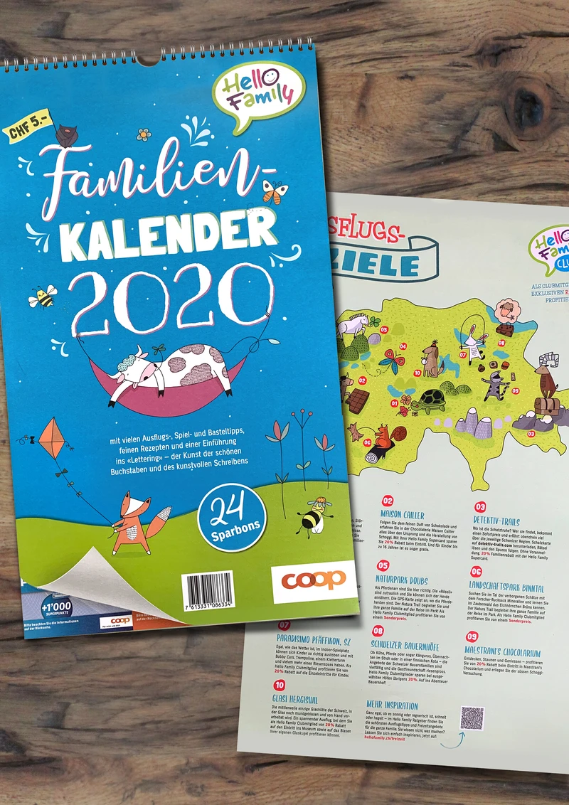 Im Familienkalender 2020 sollte monatlich ein Tier vorgestellt werden, dieses durfte in lustigen Situationen und mit Schmuckelementen in Szene gesetzt sein. Zudem wurden weitere Illustrationen zur Auflockerung eines Lageplans für Ausflugsziele gewünscht.
