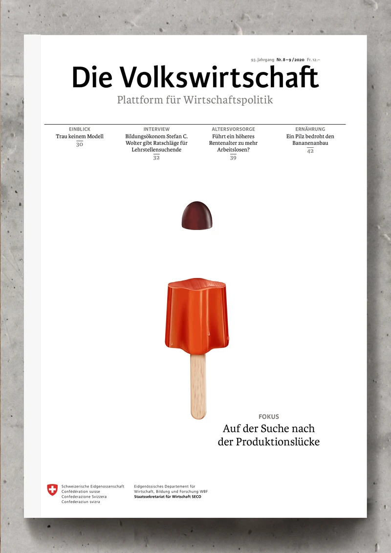 Der visuelle und inhaltliche Bezug zur Schweiz, wie auch eine interessante und humorvolle Übersetzung des Titelinhaltes ist das Ziel jeder Ausgabe. Hier im Fokus die durch COVID- 19 entstandene Produktionslücke in der Schweizer Wirtschaft. Durch die Illustration einer typischen Schweizer Marke (Das Raketeneis, lanciert durch einen Schweizer Eishersteller - seit der Mondlandung 1969) und der fehlenden weissen Zitronenschicht, wird die Lücke im Schweizer Produktionssektor allegorisch visualisiert.