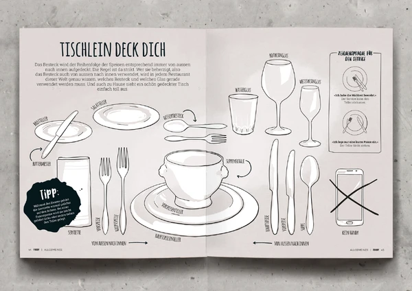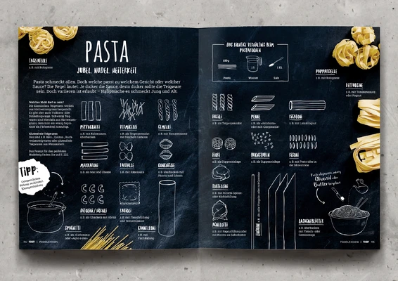 Komplexe und detailgetreue Illustrationen, wie z.B. ein Arrangement unterschiedlicher Pastaformen oder die Anordnung des Tischgedecks, sollten in einem eher klassischen Stil umgesetzt werden, damit die formtypischen Merkmale einfach erkannt werden können.