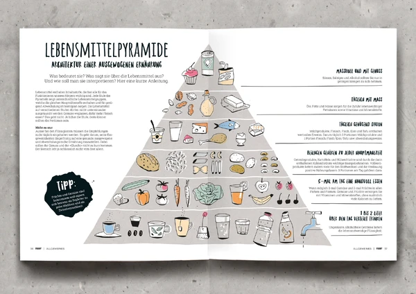 Schematische Darstellungen, wie z.B. die Lebensmittelpyramide, durften stilisierter und deformierter gezeichnet werden. Dabei ist das Übersetzen von Gegenständen in eine spezifische Stilsprache anspruchsvoll, denn der Wiedererkennungswert des Stils aber auch die Erkennbarkeit der Gegenstände muss gewährleistet sein. So ist es teils schwieriger, ein Objekt im gefragten Stil zu übersetzen, als es einfach abzuzeichnen.