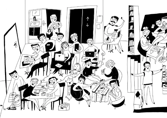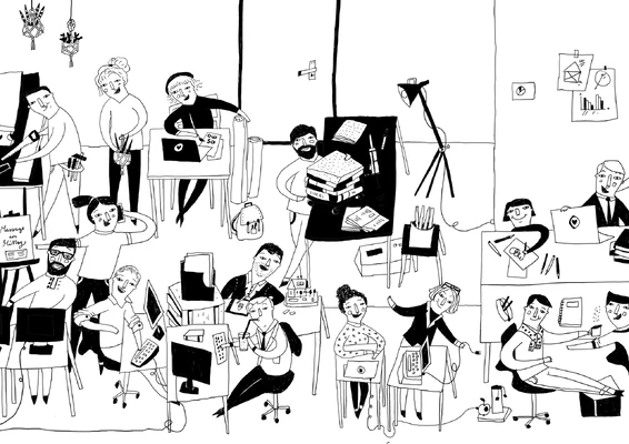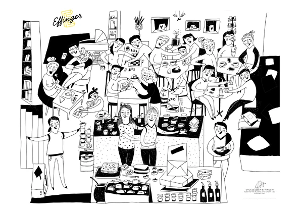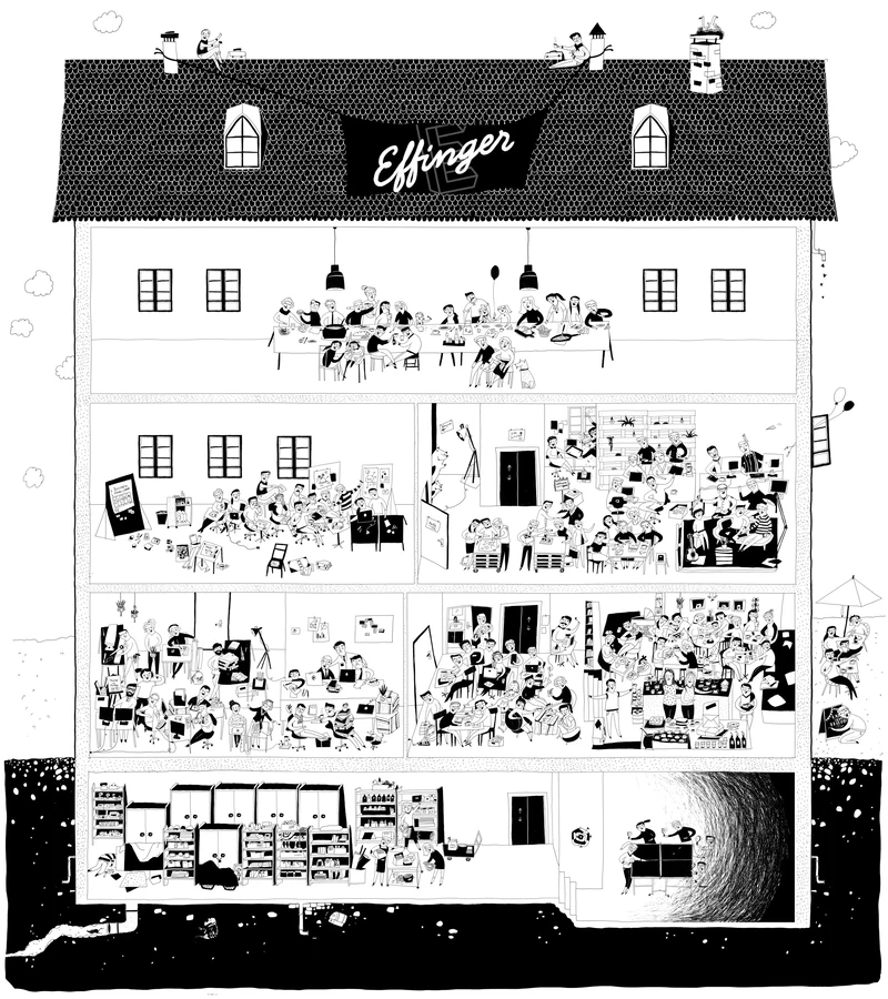 Seit 2016 bin ich im Effinger Coworking Space in Bern mit meinem Atelier eingemietet und gehöre zum Verein, der den Coworking Space betreibt und weiterentwickelt. Als Geschenk zum 1 jährigen Jubiläum des Vereins habe ich ein Wimmelbild gezeichnet, welches im Original 1.60m x 1.40m gross ist und nun in der Coworking-Lounge hängt. Es soll visualisieren, was nur in einem Jahr alles entstanden ist: Mittlerweile auf 3 Stockwerke angewachsen, haben im Effinger Bern viele Selbständige und Coworker aus unterschiedlichsten Branchen eine zweite Heimat gefunden.