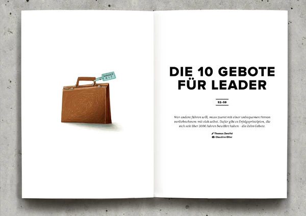 In einer kurzen Zeit musste die Idee für eine visuelle Umsetzung eines komplexen Textes stehen. Im Artikel des Wirtschaftsmagazins GO wurden die "zehn Gebote für Manager" aufgestellt, nun sollten diese humorvoll in Szene gesetzt werden. Aus den vorgelegten Ideenskizzen entschied sich der Kunde für die Metapher des Manager-Kits: Darin befinden sich alle Eigenschaften, welche eine Führungskraft immer mitbringen sollte: Diese wurden als möglichst skurrile Gegenständen umgesetzt, die normalerweise nicht umbedingt in einen Koffer gepackt werden. Somit sollte die illustrative Umsetzung einen surrealen und humorvollen Touch erhalten. "Pause machen" wurde daher als eine im Kofferdeckel angeschnallte Teekanne, Tassen und Teebeutel umgesetzt, "Wut kanalisieren" wurde als Trommel visualisiert, "Empathie" durch ein Stethoskop dargestellt etc.