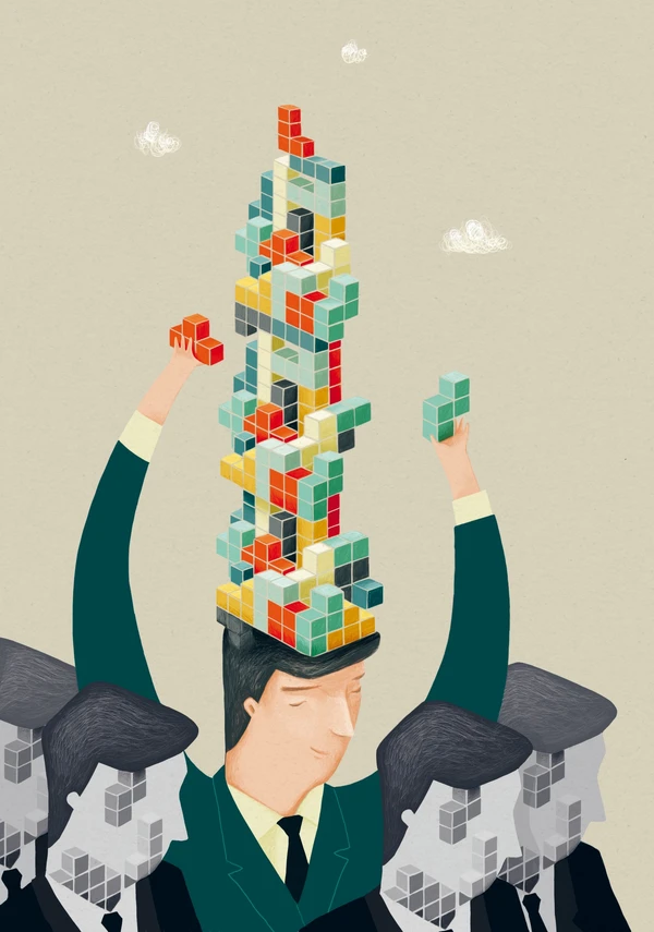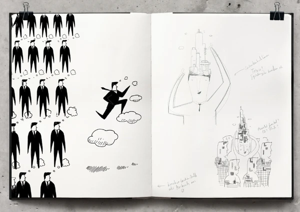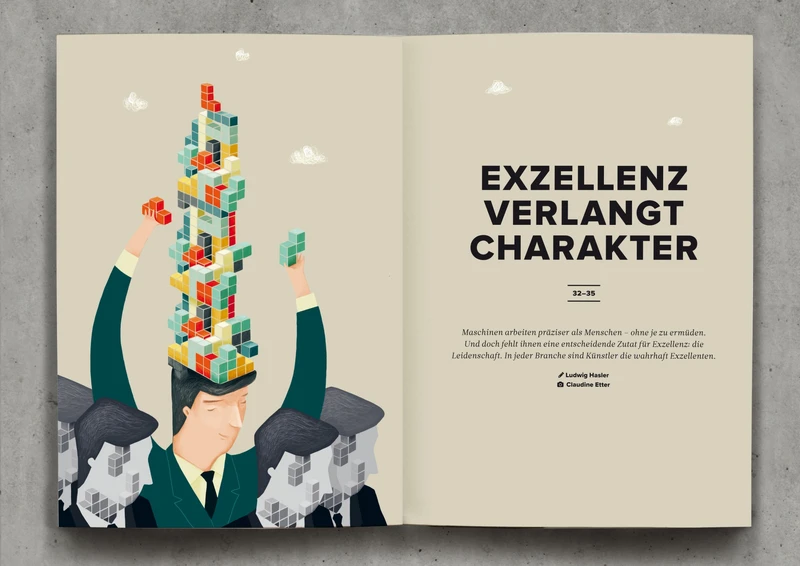 Der Kunde hat die Idee mit dem bekannten Computerspiel „Tetris“ gewählt. Es dient in der Illustration als Metapher für die gleichförmigen Abläufe und klar definierten Regeln und Normen, denen u.a. Maschinen unterworfen sind. Der Exzellente versteht es jedoch, durch seine Leidenschaft und seine Kreativität, die Rahmenbedingungen neu zu definieren und somit über Grenzen hinaus zu wachsen, über den Horizont hinaus zu denken. Er erschafft Neues, Individuelles, kreative Gebilde und Gedankenhochhäuser, er erschafft buchstäblich über den Durchschnitt „Herausragendes“.