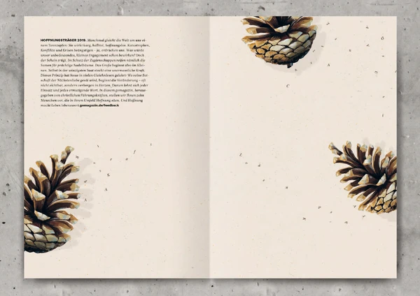 Die jährliche Spezialausgabe befasst sich mit den Hoffnungsträgern unserer Gesellschaft. Symbolisch für das Säen der Hoffnung - und da der Erscheinungszeitpunkt zeitlich im Dezember geplant war - habe ich mich für die Illustration eines Tannenzapfens entschieden.