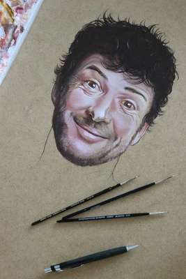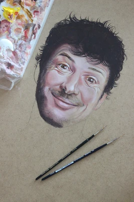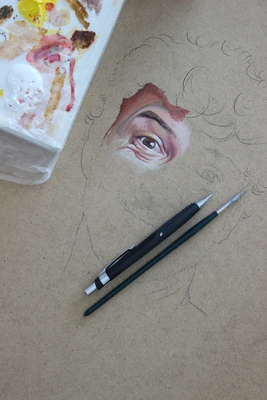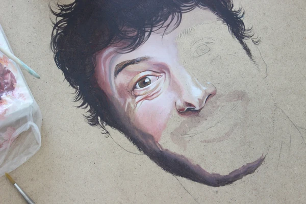 Damit ein Gesicht möglichst genau und schnell übertragen werden kann, wird es mittels Rastertechnik abgezeichnet und die wichtigsten Koordinaten mit Kohlepapier auf den Untergrund, in diesem Fall einer ungrundierten MDF-Platte, übertragen. Schritt für Schritt entsteht nun das Portrait mittels Kopieren von Gesehenem und übersetzen davon in eine gemischte Farbe, die am richtigen Ort platziert werden muss.