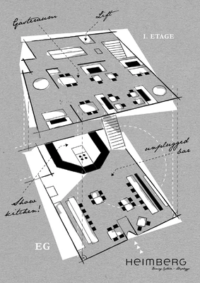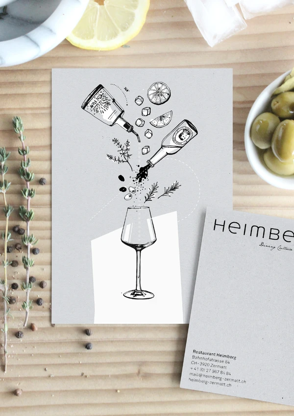 Die Wiedereröffnung des Restaurants Heimberg in Zermatt sollte mit Flyern bzw. edlen Postkarten beworben werden. Der Kunde wünschte drei Illustrationen: Ein Lageplan des 2-Stöckigen Restaurants mit Übersicht über die Angebotsbereiche, ein kulinarisches Thema und eine dritte Visualisierung mit dem Bar-Angebot.
