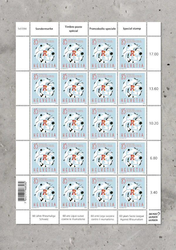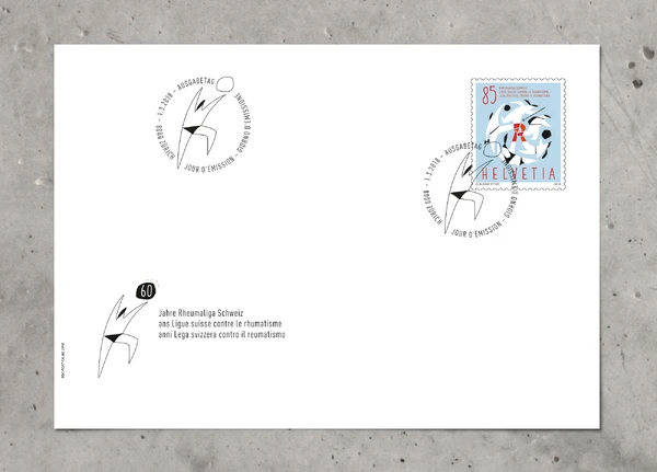 Diese Briefmarke sollte nicht nur ästhetisch sonder auch konzeptuell überzeugen: Vielerlei Vorurteile bestehen im Zusammenhang mit der Krankheit Rheuma. Die im Volksmund genannte „Alte-Menschen-Krankheit“ soll daher, als Auftrag der Rheumaliga Schweiz, aufklärend, positiv und modern dargestellt werden: Somit sind nicht nur alte Menschen betroffen, sondern Jung und Alt, Männer wie Frauen – denn mit insgesamt 1.5 Mio. betroffenen