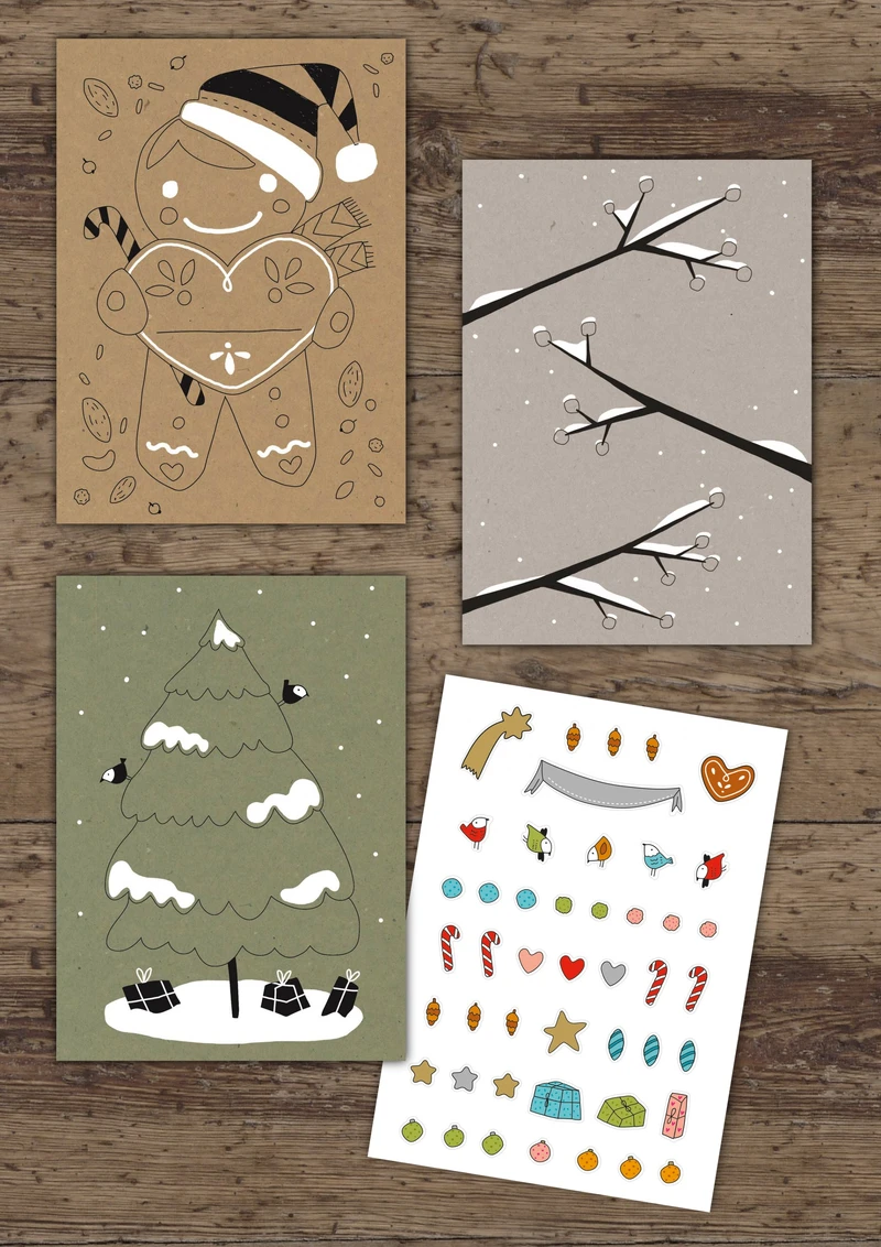 Schwierig war es, das Sujet möglichst nicht zu detailliert auszuarbeiten, dass dieses aber gleichzeitig auch ohne Gebasteltes schon ansprechend wirkt. Dabei hat sich der Kunde zur Ausführung von drei unterschiedlichen Ansätzen entschieden: So kann der Tannenbaum auf der ersten Karte, nebst Ausmalen, mit wenigen Handgriffen und unkompliziert mittels beigelegtem Stickerbogen geschmückt werden. Etwas, was jeder zu Hause hat, sollte die zweite Karte verschönern: Mit Watte, Leim und Filz- oder Farbstiften sollte der Lebkuchenmann ergänzt werden. Die dritte Karte sollte zudem das Gestalten mit kleineren Kindern ermöglichen, hier wurden lediglich Zweige und Schneeflocken vorgedruckt, worauf mit Fingerabdrücken einfache Figuren bzw. Vögelchen angebracht werden können.