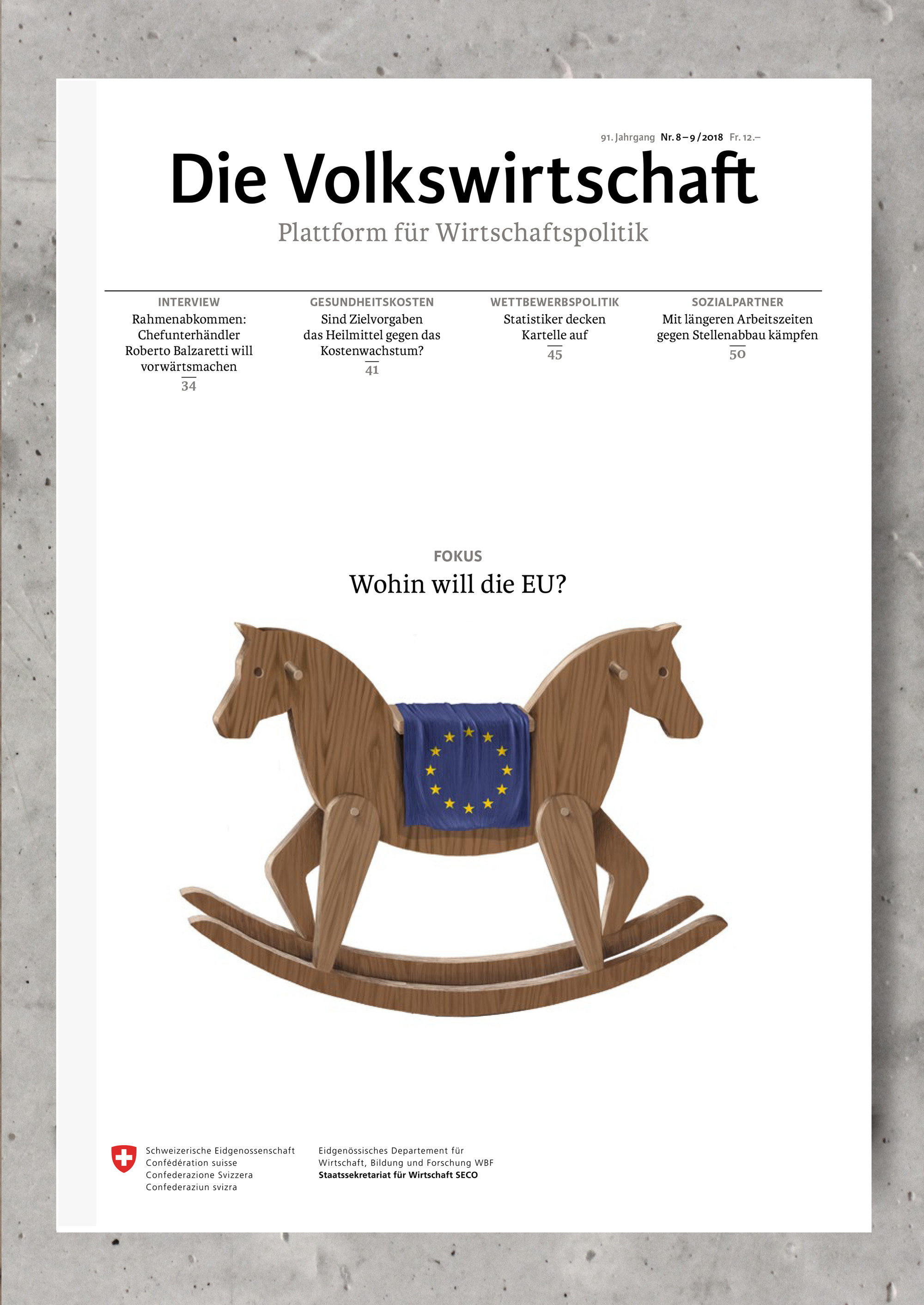 Für das monatlich erscheinende Magazin "Die Volkswirtschaft" habe ich eine eigene Bildsprache konzipiert, welche die sachlichen Themen auflockern und humorvoll visualisieren soll. Hierbei beschränkt sich die jeweilige Coverillustration auf die Darstellung von verfremdeten oder zweckentfremdeten Objekten, welche als Bildmetaphern das Heftthema aufgreifen, interpretieren oder ergänzen.