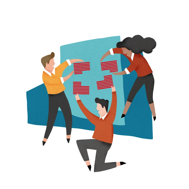 Als zu illustrierende Begriffe wurde "Zusammenarbeit", Kontinuierliche Verbesserung", "Kundenorientiert", "Selbstverantwortung", "Wertschätzung" gewünscht. Der Stil sollte laut Briefing "cool", "modern", "bunt" und "abstrahiert" sein. Komplexe und wissensvermittelnde Inhalte können mit dem von mir gewählten Zeichnungsstil modern, erfrischend, einfach zugänglich und dezent humorvoll visualisiert werden. Zugeschnitten auf die Erscheinungsform der Firma und die Bedürfnisse des Zielpublikums können somit nicht nur Schemen oder Begriffe gezeigt oder erklärt werden, sondern auch zwischenmenschliche Situationen und Handlungsabläufe. Zudem habe ich hier speziell für die Visualisierung der Unternehmenswerte das Logo der Firma spielerisch integriert.