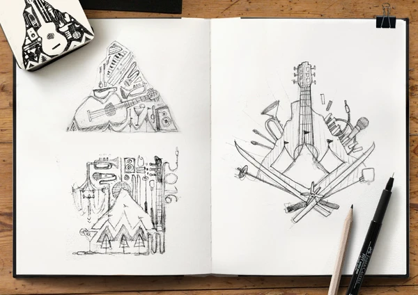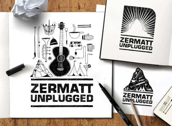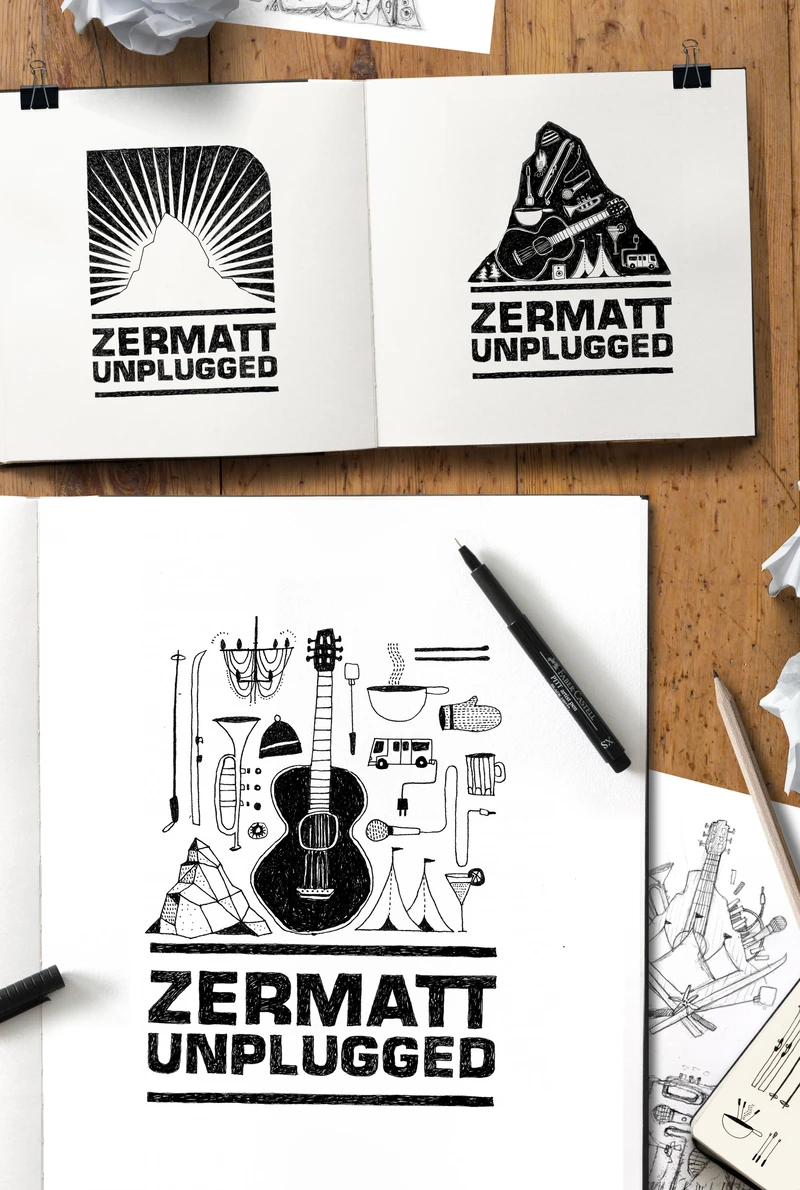 Wer kennt nicht das tolle Musikfestival in Zermatt oder die heimeligen Fotos von Zeltbühnen, stimmungsvollen Kronleuchtern, und weissen Bergen im Hintergrund? Aufgrund meiner Holzpostkartenserie „Swiss Greetings“, welche auf der Agenturplattform petiteposte.com angeboten wurde, fragte Zermatt Unplugged für die Illustration von vier Labels und dazu passende Icons an. Diese sollen auf Merchandising- und Souvenirprodukten angebracht und die Icons zudem auch als Wegleitung auf der Festivalkarte eingesetzt werden. Auf den Labels sollten möglichst die für das Festival typischen Items zu sehen sein: Das Festivalzelt, eine Gitarre, der berühmte Kronleuchter, der Elektroshuttlebus, Instrumente und natürlich das obligate Fondue durften nicht fehlen. Zur Auswahl der Bildidee wurden für den Kunden einige Skizzen angefertigt.
